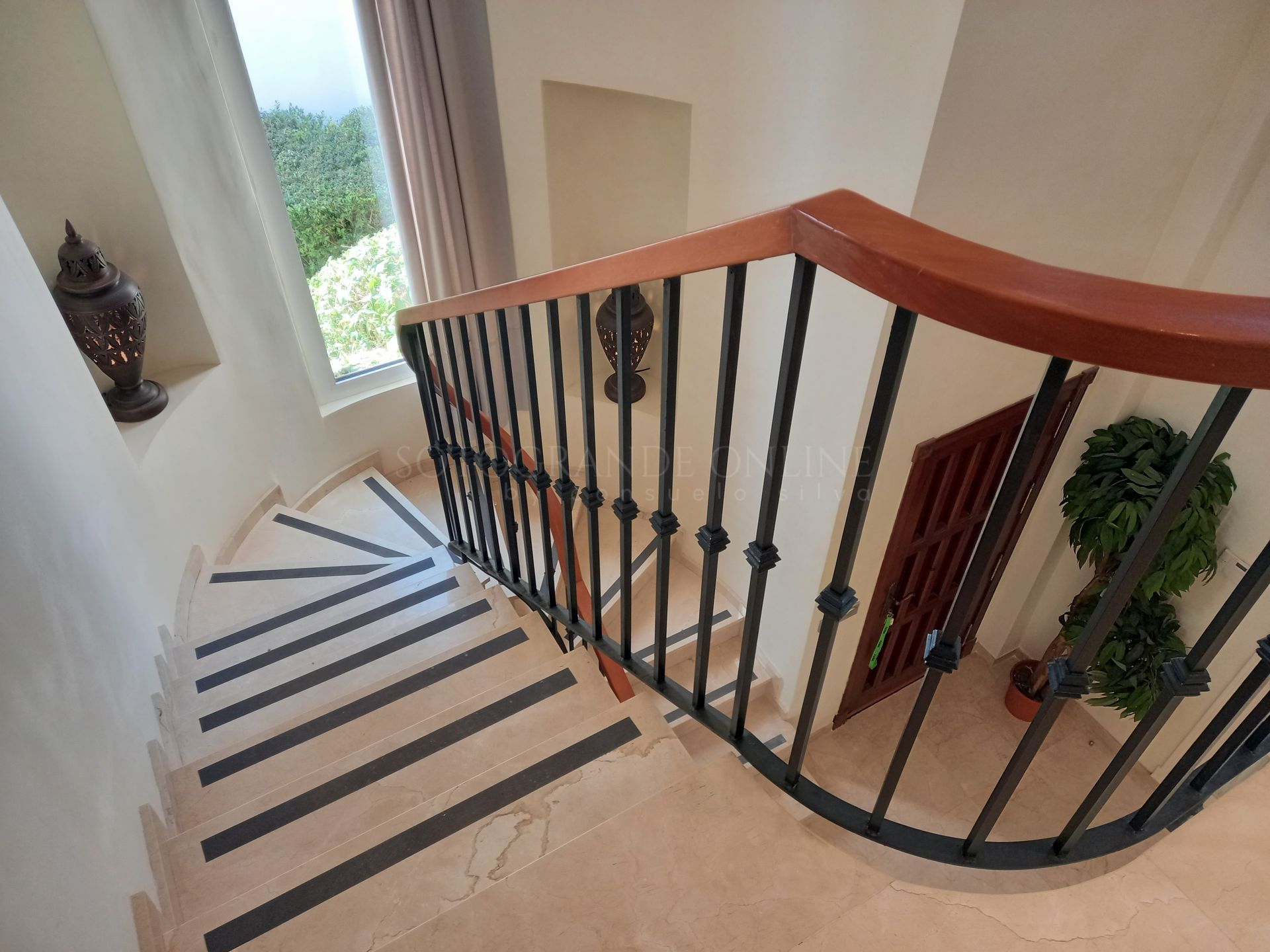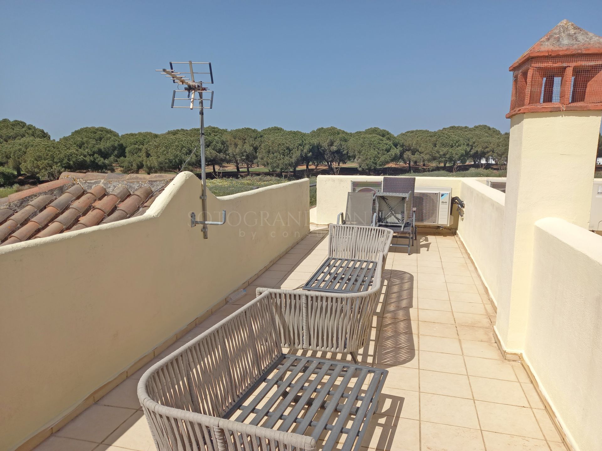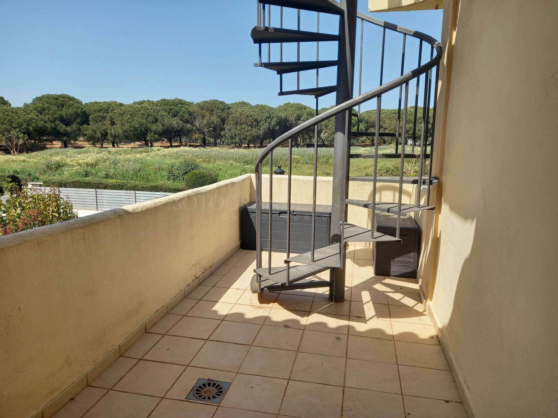 Staircase leading to the solarium with panoramic views of the sea and golf course, a perfect space for relaxation or outdoor gatherings.